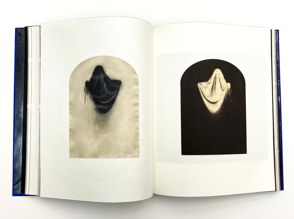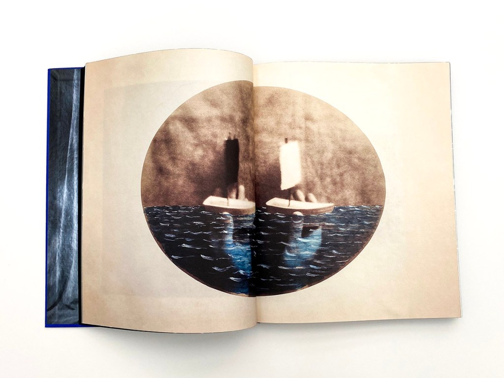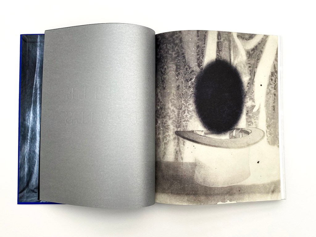 Forever & Never is a playful book, full of clever sleights of hands, a style of performance that feels akin to a middle school play, and complex ideas about the mysteries of life. Beautifully designed by Elana Schlenker, the book has a glowing cobalt blue cover, a mask of the artist’s face stenciled in the middle with a small hole burrowed between his lips. The bound pages are printed to make them look both like a tabletop stained with silver nitrate and a primitive map of the heavens. Opening the book, the endpapers are glossy and radiant pages depicting the artist’s studio, an illuminated mirror at the heart (appearing as though originally photographed in a wet collodion process). The following pages, a more traditional matt finish, illustrate a narrative of a man performing small, staged scenarios that explore the elusive mysteries of love, childhood, fantasy, death, mysticism, and photography. The book is divided into three chapters – Little Devils, Ghosts and Models, and Broken Fingers – and each of these is composed with pictures Estabrook made between 1999-2024 (personally, I love when photographers can demonstrate so much patience with their vision). Conceived as objects as much as images (one of my favorite attributes of alternative process photography), Estabrooks photographs use an incredible range of processes – calotype negatives embellished with graphite and an Xacto knife, rich and lovely palladium prints, touches of watercolor, albumen prints mounted on cardboard, and silver gelatin prints reconfigured with bleaches and toners. In his 25 years of photographing, there is one character that repeats throughout, his alter ego, a sort of magician adorned with a top-hat – appearing elusive but relatable, clever and creative, conceived as an everyman experiencing all the complexities of love and life in the 21st century while reflecting on the nature of photography, perception, and history.