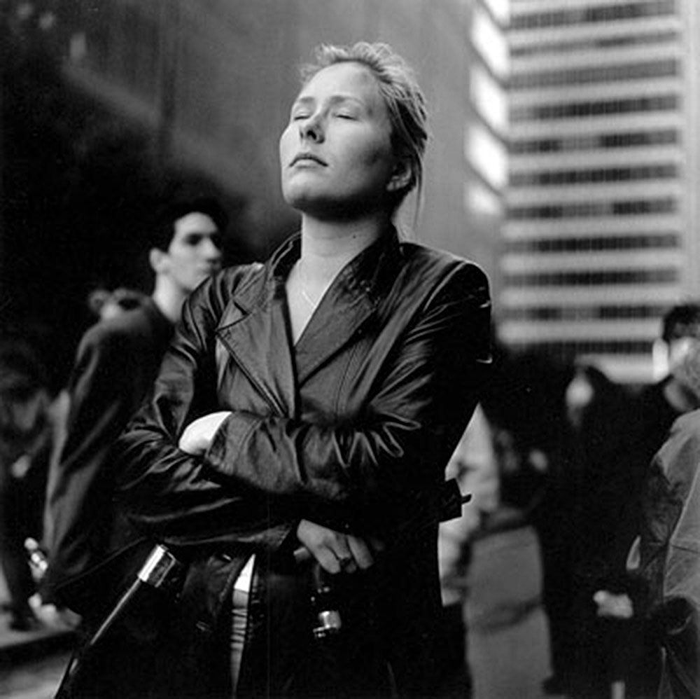 Bubriski appears to be invisible, as he does not have direct eye contact with his subject. Something far greater and more important seems to capture and be mesmerizing the bystanders and viewers. The camera’s perspective is low, probably using his Hasselblad with the simple viewfinder at chest height. The camera is not held at eye level, not necessarily concealed, but subtle and not obvious and thus not interfering with the other’s experience. The resulting effect is to create towering individuals, perhaps representing these pilgrims as the new towers of NYC, who are standing tall and not humbled by the catastrophic events.