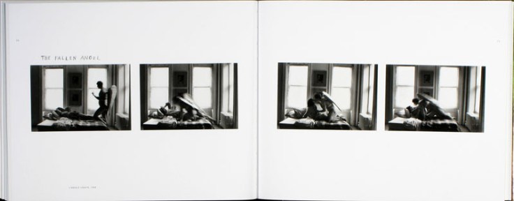 The book ostensibly sets out to describe the broad spectrum of Michals career, which it does very well, but excludes his combination photographic/painting that were not received to wide acclaim in the 1980’s. This retrospective begins with his earliest portraits, which paved the way into his commercial career. Michals’s multiple exposure portraits of the famous painter Rene Magritte, pair of photographs below, foretold of his well-known “Sequences” of the late 60s and 70s. In the use of the double exposures, Michals weaves in other trademark elements of Magritte’s paintings in this iconic portrait.