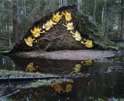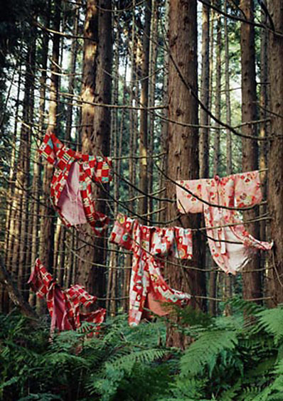 She creates site-specific sculptures utilizing second-hand clothing from flea markets and thrift shops as found objects, and then records the fleeting sculptures with suburb color photographs. Her work is similar in emotion content to that of the British sculpture Andy Goldsworthy. In contrast to Goldsworthy’s utilization of the found natural materials of stone, rock and sticks, Paivalainen introduces a man-made element that speaks both directly and indirectly to the presence of humanity.