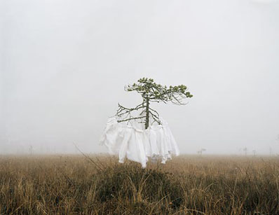 Her photographs capture a dream-like beauty that has both energy and space. The earth is usually still and grounded, sharply delineated, creating a strong and lasting presence. Meanwhile the clothing is light and fragile, transitory and fleeting, much like a good conversation or a memory of the past. I find a magical quality in her body of work.