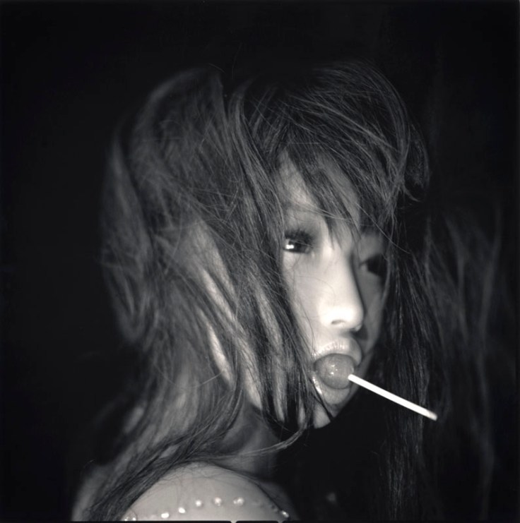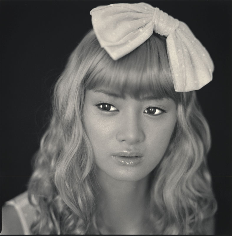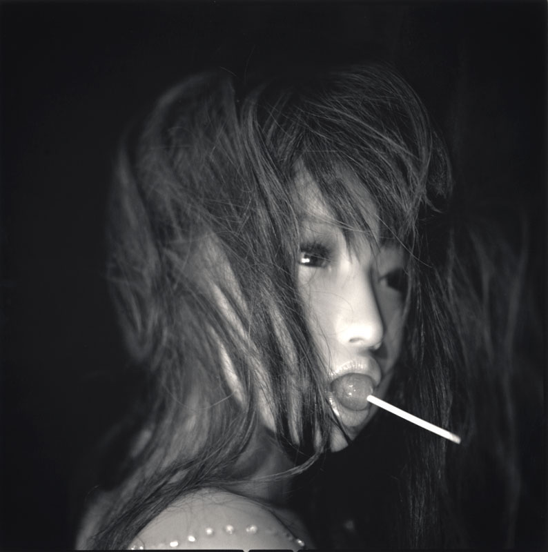 One of Watanabe’s models appearing to be in the process of un-dressing, stripping, and playing a fantasy role. Some of the other images have shallow depth of field with the eyes, mouth and nose in focus, and the hair and clothing slightly out of focus, soft, and sexually alluring. They all have similar expressions with the models eyes wide open, expectant, unblinking, with the mouth slightly closed, with the exception of the one model with the sucker protruding from the puckered lips, an innuendo of oral sex. All of these portraits seem to me to be suggestive, flirtatious, and seductive, conjuring an imaginary and fantasy world.