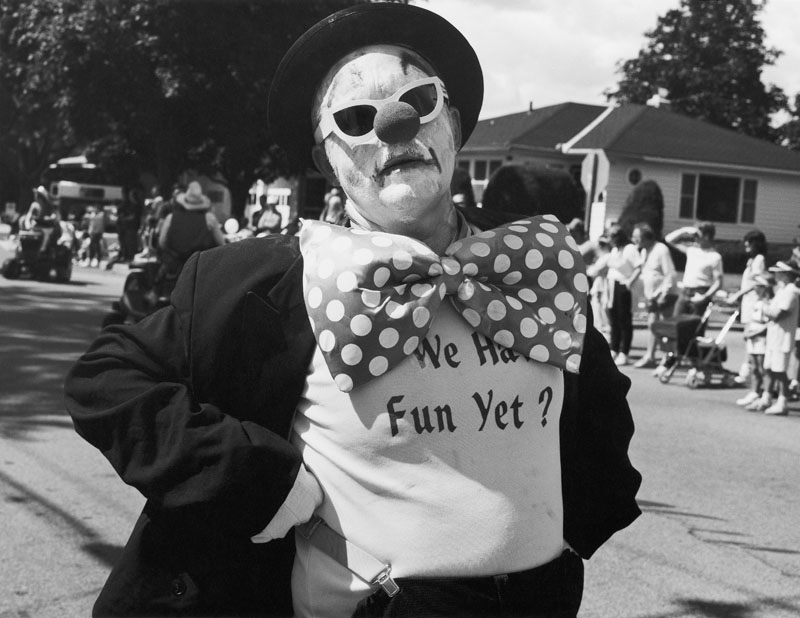 Meanwhile, the singular images read very well. A dour looking white-face clown stands facing the photographer with the ironic text We Ha Fun Yet written on his shirt. At an apparent sales lot, multiple OK signs are festooned on the abandoned and rundown property. A pair of doors on the side of a building, with a number 3 on both doors and a giant spray-painted 3 and arrow pointing to the same doors, belabors the obvious.