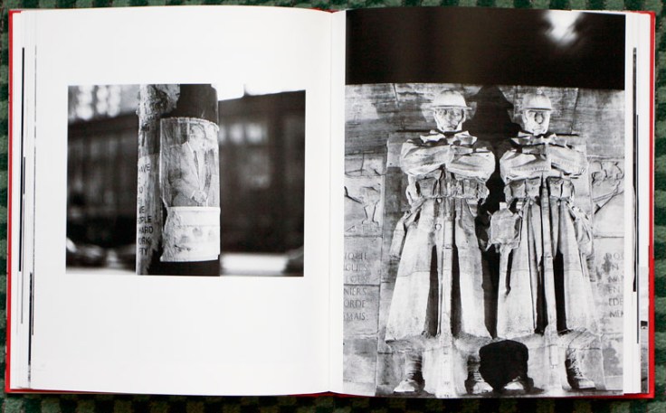 Although most of the individual images work well, Koch is also very adept at editing and pairing photographs across the page spreads to provide a little more biting story. The combinations can be very subtle, such as the spread illustrated below. The photograph on the left includes a poster of a smiling Reagan and Bush shaking hands, while on the facing page is a full bleed (hope you note the implications) photograph of a gray statue containing two soldiers, arms crossed and appearing very grim and unapproving. The added external context found in the accompanying captions identifies that this statuary is part of a war memorial. It is probably not a random or chance event that the photograph of the Reagan and Bush poster reveals that the poster itself is faded, torn and deteriorating.