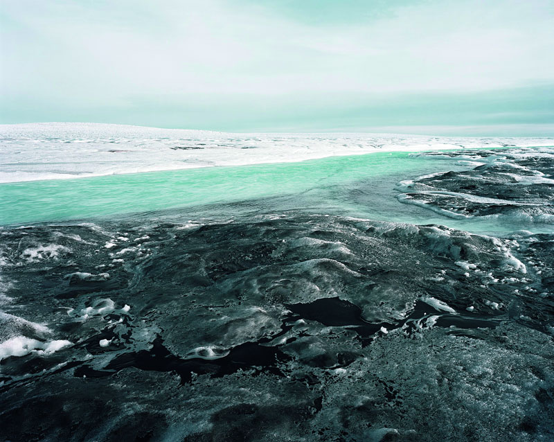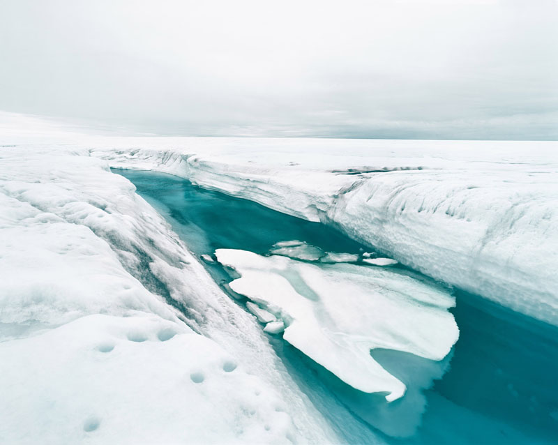 Olaf Otto Becker’s Above Zero is a beautiful documentary style narrative about the melt water of Greenland’s ice cap. Becker investigates the annual melt water that occurs each summer. It might seem that finding the presence of running water on top of snow and ice to be indicative of environment changes, but in fact the running melt water is an annual occurrence. During periods of the midnight sun when the daily temperature rises just above the freezing point of zero degrees Celsius, snow and ice will melt and small runs of melt water eventually converge, creating streams, rivers and shallow pools resembling lakes.