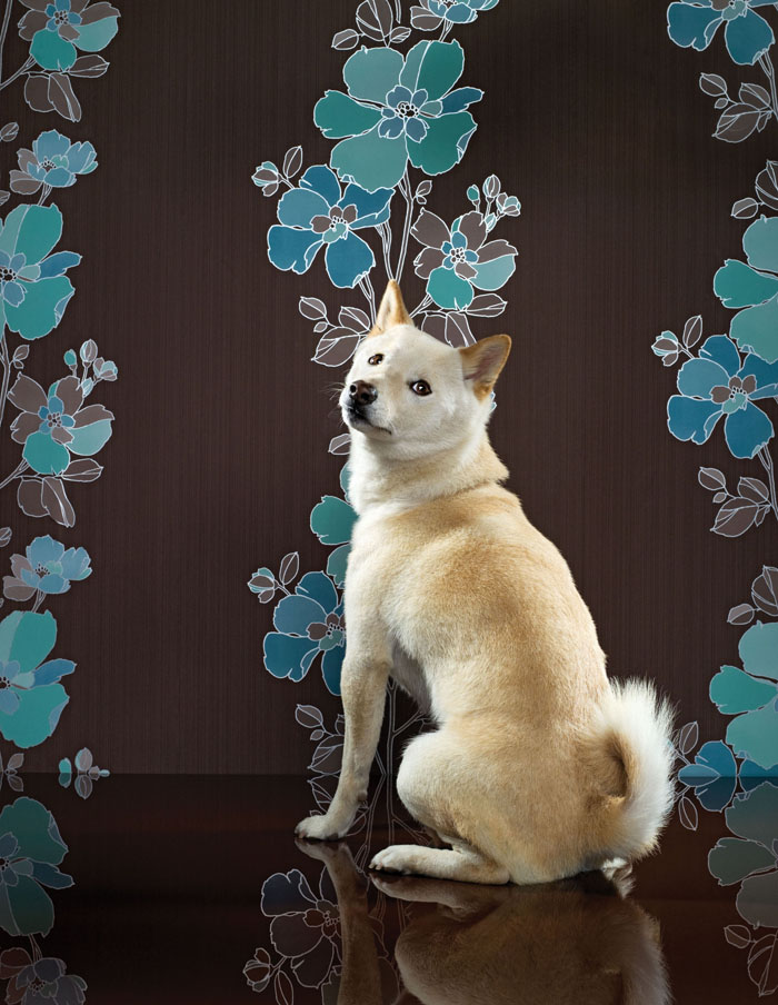 Ledner’s canine subjects are being provided with either a unique posing device or they occupy a central place on the floor. Each dog is framed by a unique wall paper that has been paired with the animal to complement some aspect of her subject. The lighting, focus and use of color are all provide with a similar treatment for each photograph. Her subjects are usually centered in the frame, with some of the dogs providing direct eye contact with the lens, others focused just off-center or preoccupied with something else, perhaps the animal’s trainer or owner.