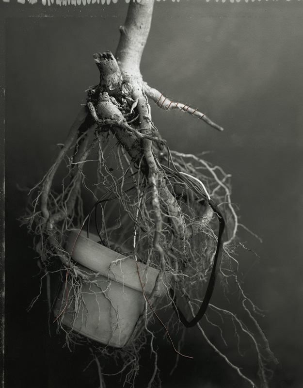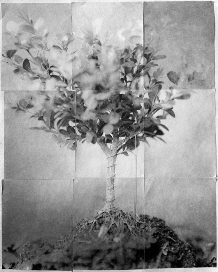 There are three motifs within this body of work, the multi-paneled prints of small potted trees, the simulation of the connections with natural and artificial objects, and the sewed prints with the visible threads. Of the three, the sewn prints provide a slight three dimensionality even when presented in this photobook. The threads appear to be laying on the surface of the print which relies on our memory of the print’s flat plane and the three dimensionality of the thread.