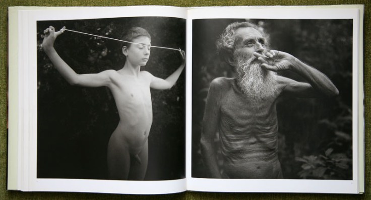 The book images are usually sequence one photograph per page and one page per spread. When two photographs are paired thees are complementary and echo each other’s narrative such as the diptych of George and Jacques, second image below. To make a further connection between the two images both have a similar darkening and fading away of the light towards the edges of the frame correspondingly making their faces lighter and appear to be glowing. This photographic lightening technique is an attempt to guide your eyes towards the lightest region within the photograph and in this case their respective faces.