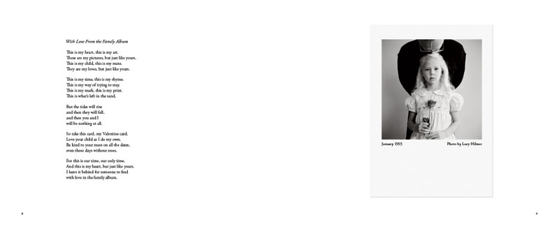 Over a period of twenty one years, Lucy Hilmer in partnership with her husband, daughter and many long stem roses, created a series of black and white photographs. These photographs were subsequently printed as postcards and mailed to family and friends to celebrate Valentines Day, an American holiday of love and romance.