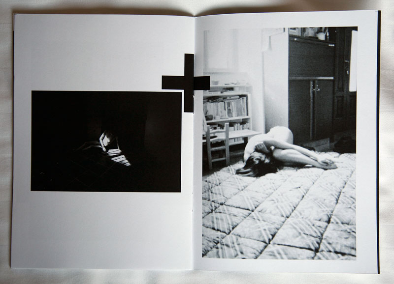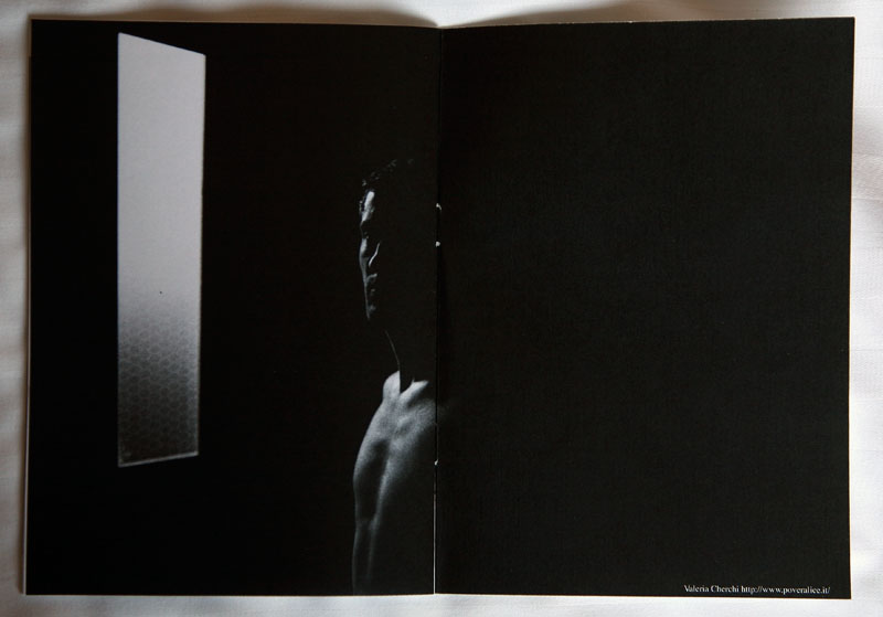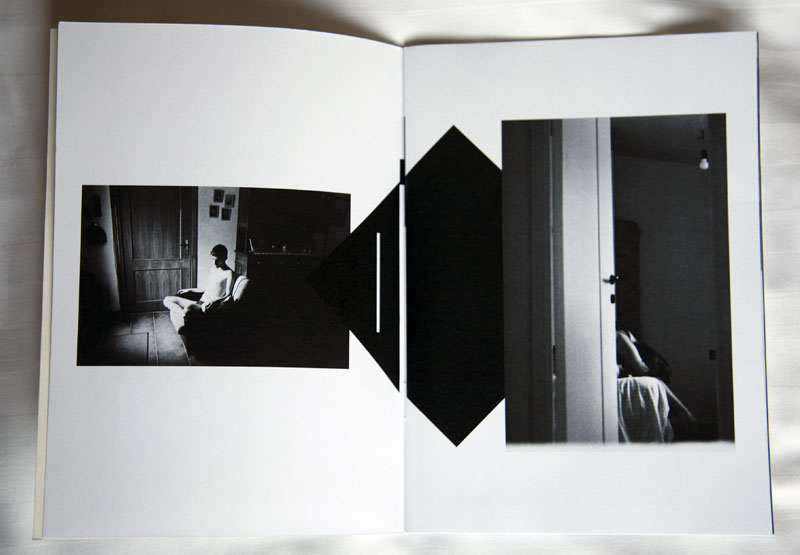 Cherchi’s black and white photographs are stark, tightly framed and border on being minimalistic. With a minimum of content, it can allow the reader more freedom to fill in the unanswered spaces. The minimal clothing of both individuals implies the appearance of vulnerability and accessibility that perhaps they have nothing to hide between themselves. Yet they do not appear together in any of the photographs and at best, are in separate photographs on facing pages, with the implied dialog crossing the binding of the book, as though the binding is a silent and imaginary barrier between the two.