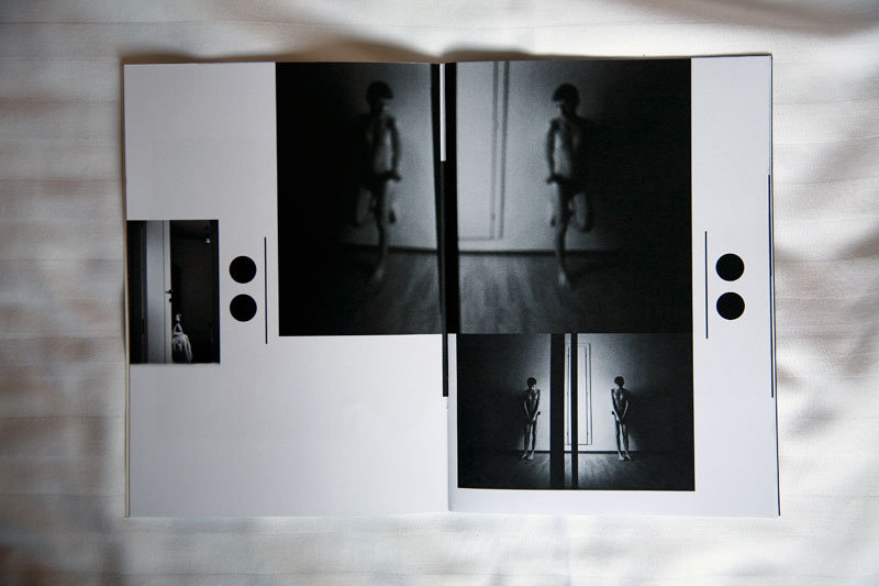 The last photograph of the book spans the two page spread and is printed full bleed. The man continues to stands alone, now in a three-quarter profile, shrouded in the semi-darkness, his profile lost the in deep shadows. It is a stark, graphic, haunting, and eerie photograph. There is an illuminating window pane just behind him and it appears to be part of a door. This dark image of the shirtless man creates an ominous and foreboding feeling of an implied threat to who may be just beyond the other side of this door. What I might call an Alfred Hitchcock moment.