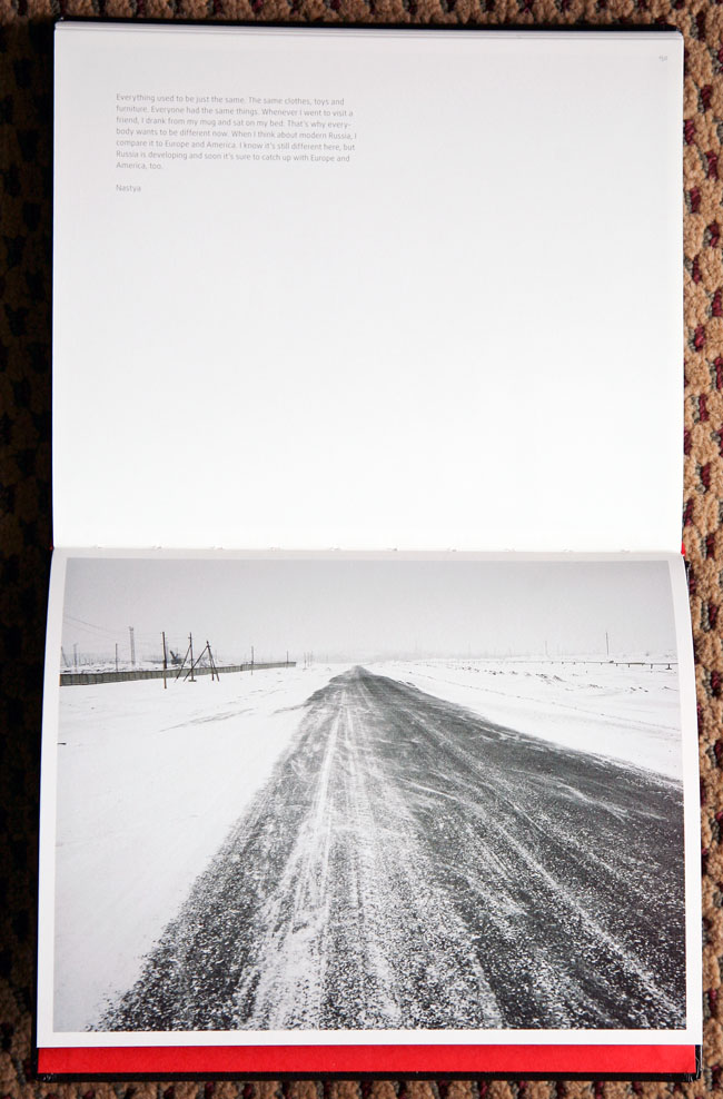The seven short stories attempt to provide a collective insight into his subject’s existence in this region of the Soviet Union, with a heavy dose of reality clashing with hope. Accompanying each narrative are quotes by his subject to broaden the visual context.
