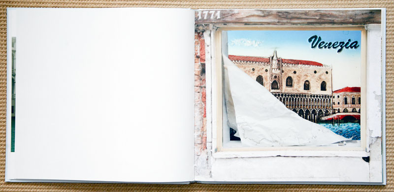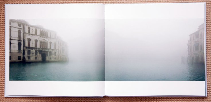 Camporesi states: “The book is a dreaming diary, composed of views of the city and short texts. The project explores places through the filter of imagination and dreams, divided in 4 thematic series: “Foghorns” (city images lost in the fog); “Souvenirs” (typical Venetian objects staged in anonymous locations around the city); “Ghosts” (legends and surreal places which take place in Venice); and finally “where water begins” (tales of real and imagined floodings, of buildings and churches).”