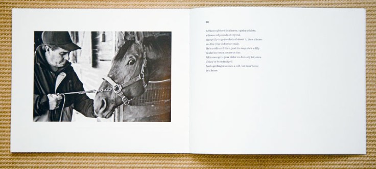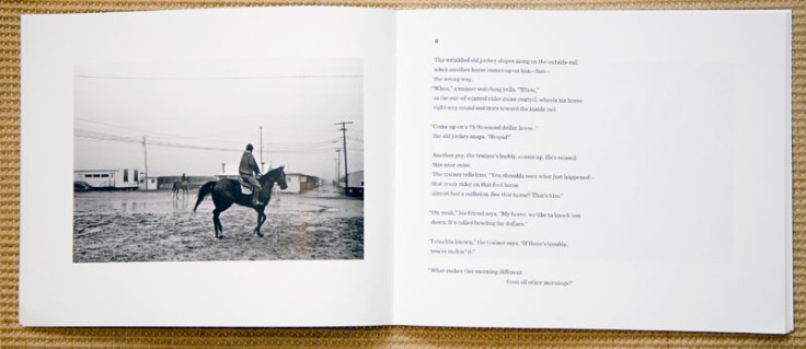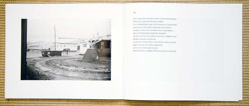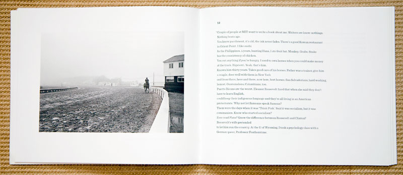 As a book object, it is a stiff cover, lithography printed and sewn, horizontally designed book that reads very well, as the book lays open nicely in your hands. The horizontal book design is nicely matched to the horizontal black and white photographs, each with an ample amount of a white margin.