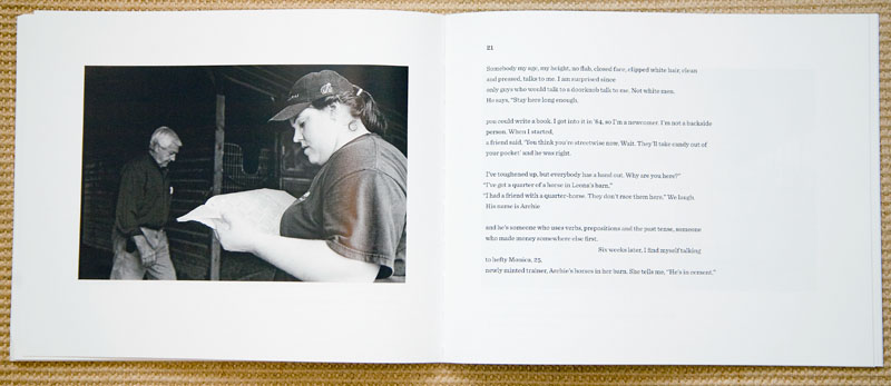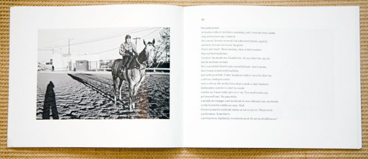 As to the layering of the poetic writing that is interlaced through and around the interior photographs, I will rightful leave that to others to critique. Nevertheless, the writing has an interesting cadence as she attempts to capture the dialect of her subjects.