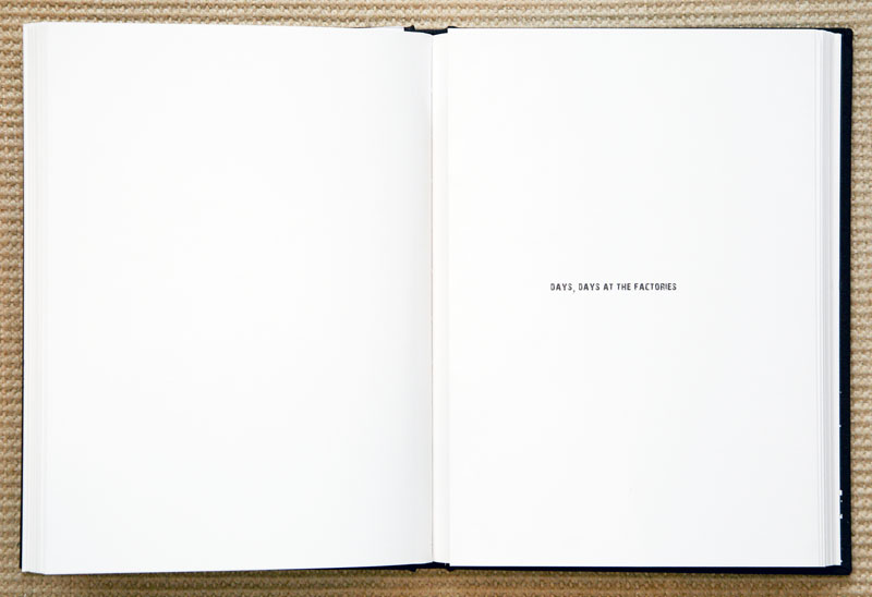 The book object is very intriguing, the hard cover is foil blocked and embossed and all of the photographs are hand-folded gatefold running concurrently the length of the book. Opening the series of gatefolds results in a slower read in which the viewer may have more of an opportunity to reflect on the content. The book is accompanied by a unique seven-inch vinyl record produced from the factory floor. The recoded audio is Days at The Factories c/w CuSO4 Shuffle.