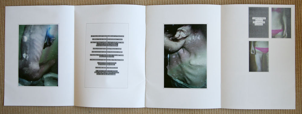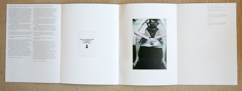 The photographs reveal how the subjects document their current state of “success”, usually standing partially undressed or nude in front of large mirrors situated in bathrooms or bedrooms, posing to reveal the their protruding rib and hip bones, sunken stomachs or boney wrists or legs that are skinner than their knees. Abril edited and designed the layout of the resulting photographs to create a visual map of this destructive state of mind with the double gate-folds hiding and then revealing this complex condition, perhaps symbolic of how the women attempt to conceal/reveal what they are attempting to accomplish.