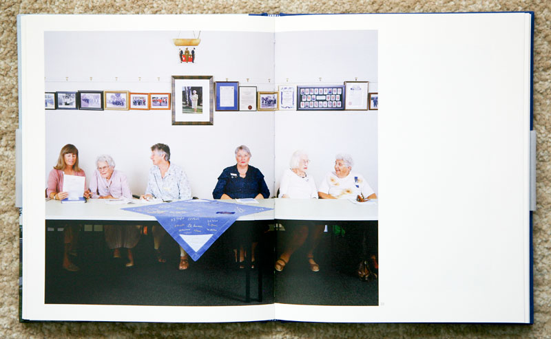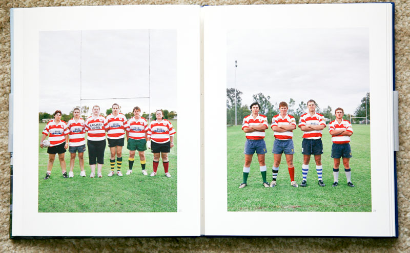 Their photographs frequently have a humorous undertone, sometimes subtle, sometimes bordering on cliché. They explore the visual metaphors for what it may feel like to be ostracized by a lager or peer group; a single cow in a meadow, a singular tree in a field, a women dressed in black (an interesting version of who might be the “black sheep”) who appears to be ignored by all of those who surround her as she appears to vainly stare into the camera lens. An interesting layering of the narrative is the double-page spread of the athlete group portraits, which opens to a double gate-fold of the four cut and topped trees.