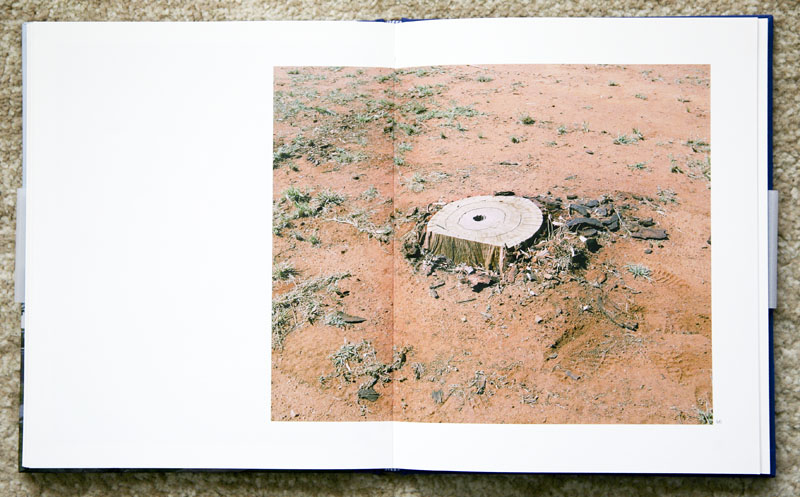 The case bound book includes a translucent belly band that is permanently attached to the inside of the covers, creating yet another interesting metaphor. The plates have a slight luster and read very well, with the page stock a slightly creamy color that works well with the overall book presentation. The color plates are numbered with the captions are summarized in a table at the end of the book. The accompanying text is minimal, only to provide a high level summary of their concept for this project. The book has two double-gate folds which creates a nice layering to their narrative, with one of the two gate folds provided below. The use of a gatefold is a layout design that appeals to me, as it is similar to peeling an onion to dive deeper into the narrative as a potential layered reading of the photographs.