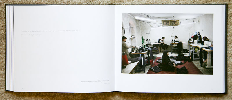 The book object is an elegant embossed hardcover book within a printed slipcase. The color photographic plates are numbered and captioned and the facing pages interspersed with quotes from the subjects as well as from Afghanistan writers and poets. The Afterwords’ are written by Clare Lockhart and Karim Merchant and the photobook design is by Bostjan Pavletic.