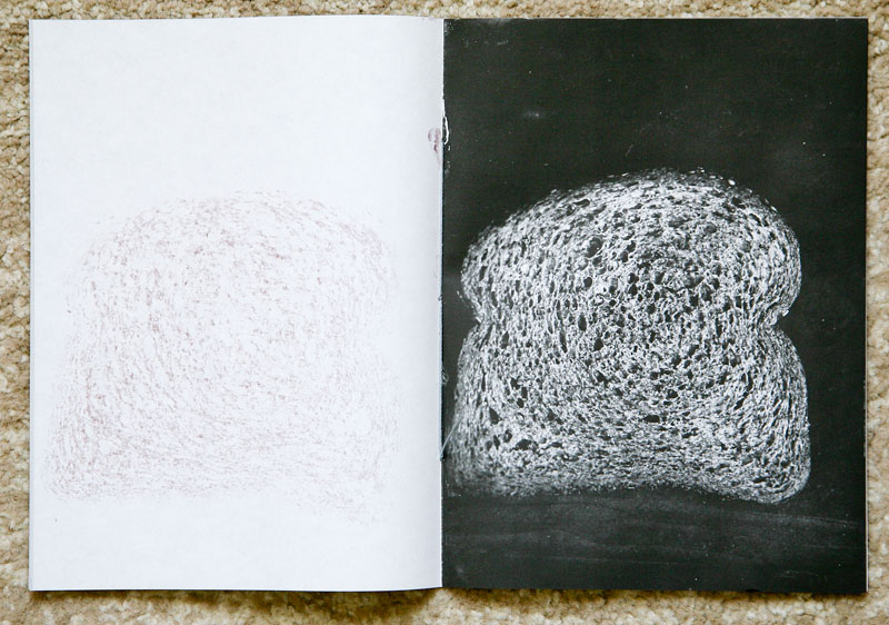 The one booklet of the Sesame whole wheatbread is interesting due to her selection of paper. The paper is not entirely opaque, in that the printed image bleeds through the back of the paper. Thus while reading the photograph on the following page (on the right spread), there is a ghost image that lurks on the left page of the spread. It is as if one is looking so intensely, a latent image is imprinted on the retina that is still retained after one looks away.