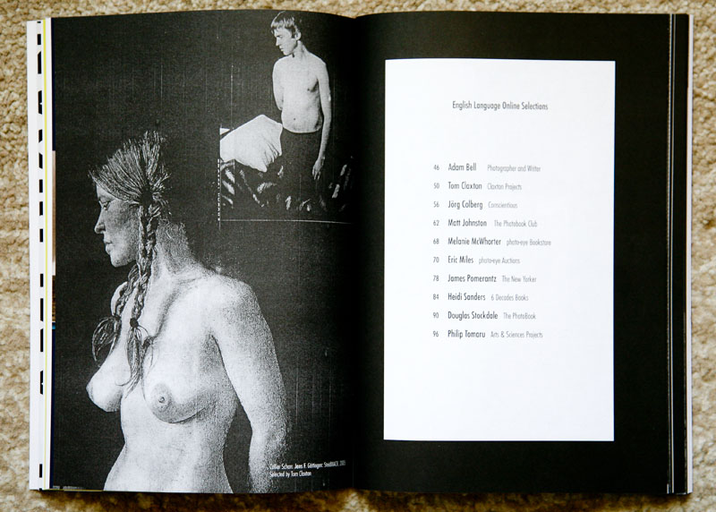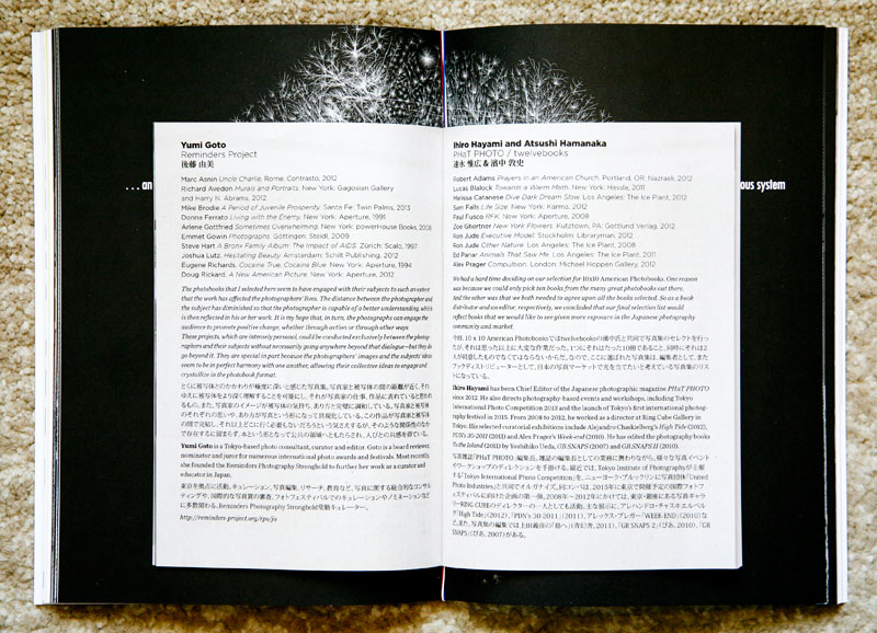 The catalog is a compilation of essays by 17 photobook writers, features the photobooks that were included in the reading rooms at three exhibition locations as provided by 10 contemporary photobook luminaries, the on-line photobook selection by 10 American contemporary photobook luminaries (including mine, thus revealing that I might have a slight bias towards this catalog), and an insert with the American photobook selection by 10 Japanese contemporary photobook luminaries.