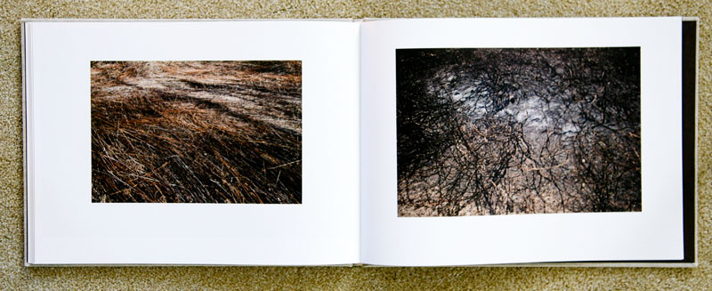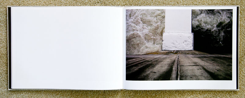 The case bound photobook is designed, printed and bound in a classical style, with a tipped-in image on the cloth cover. As an interesting twist, there are two title pages, with the top leaf torn in half through the text, hinting at violence as well as something that might not be complete. The book does not include any additional clues for the reader, as it is without a text, pagination or captions for the plates.