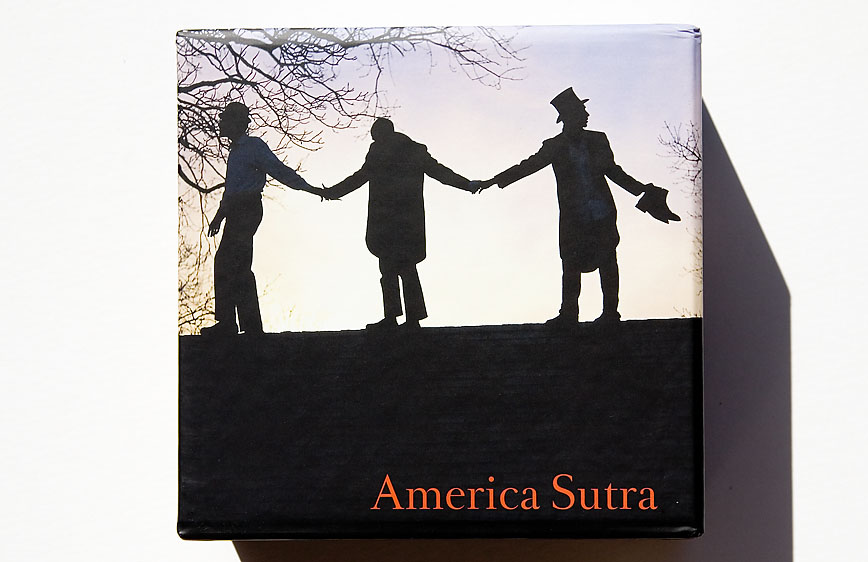 Seven stiff-cover books, four color lithographic printing and perfect bound, all in cased within a hard slip-cover. As a result of the perfect binding, the book’s interiors can be vexing to read as they do not easily remain open. The seven volumes are a part of a multi-media web-based art presentation containing video, images, text and sounds, found here: http://www.americasutra.com For my review, I was working with the second edition of America Sutra.