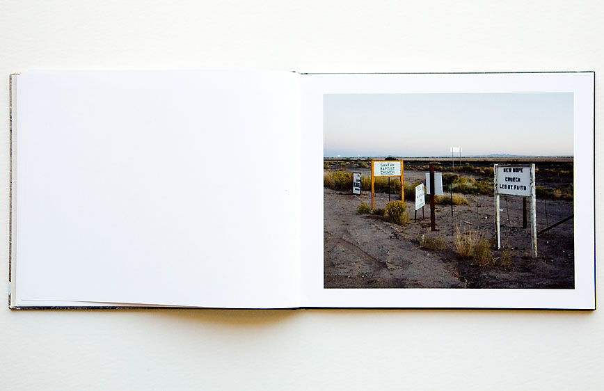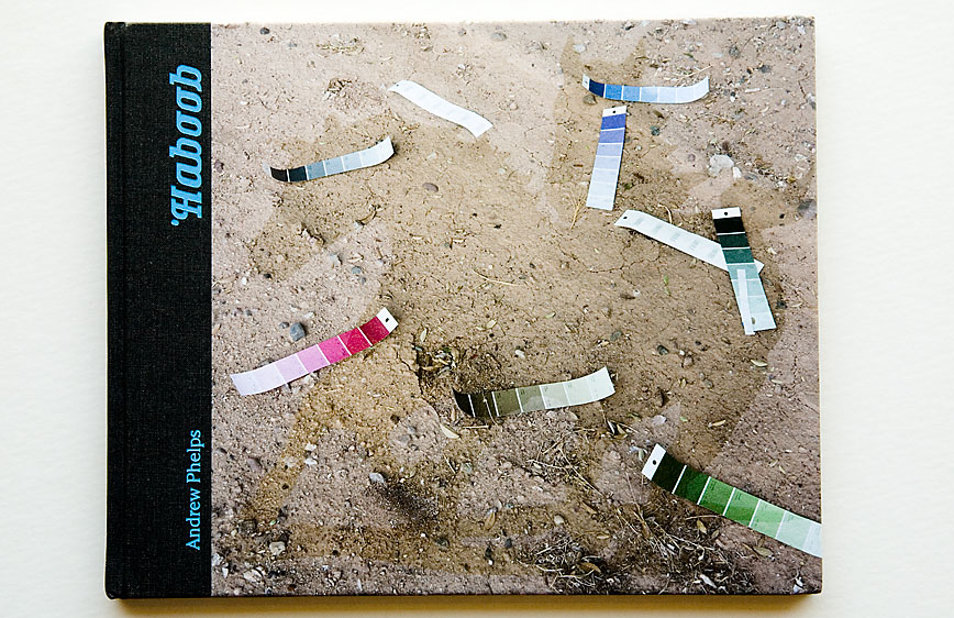As a book object the printing and binding are excellent as you would expect from a Kehrer publication. The layout of the photographs is classical with ample white margins and a nice cadence in the flow of photographs. The front cover has a lacquer coating that depending on how the book is held, will reveal to the reader the silhouette of what appears as two running horses. This a subtle hint at the wild animals which had at one time roamed what is now trim and proper suburban neighborhoods. An interesting layering, as this lacquer coating is situated on the subject of the cover photograph; paint strips used to select colors for decorating homes, which appear to be discarded on the desert floor.