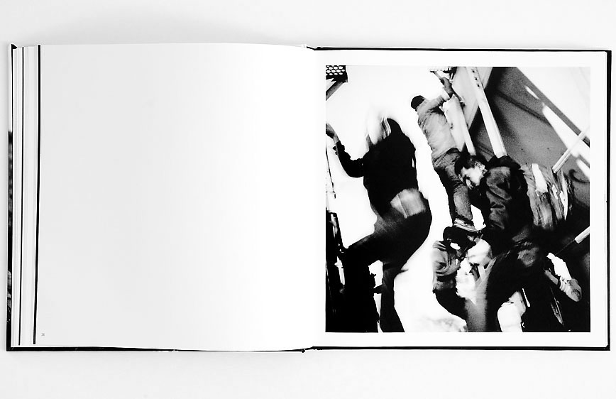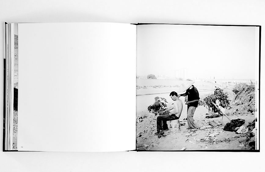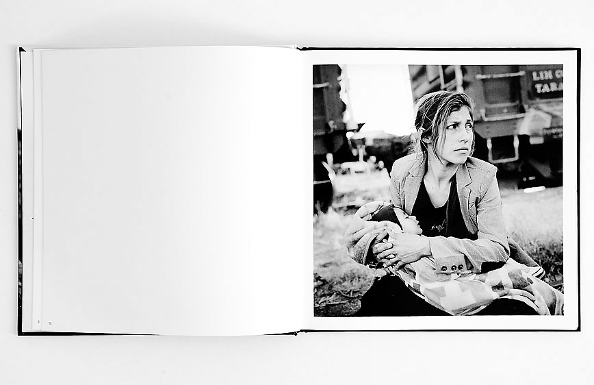 Her black and white photographs alternate between a full bleed images to a classic border with paper white margins. The images alternate between a single photograph on a double page spread, which provides singular emphasis, to pairs of photographs facing across the book’s gutter. Most of the paired images one image is full frame while the facing image is smaller encircled with large white paper margins, which creates an interesting interaction between the two photographs.