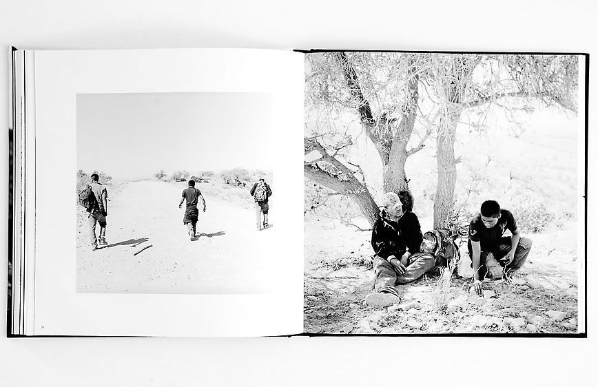 The photographs are very sensitively composed with her subjects photographed from a close and intimate distance. These portraits are intermingled with the passing landscape photographs, slightly larger in scope and providing a context to her subject’s journey. As an example the photobook’s cover image is a subtle story. The man in the right side within the frame has his eyes focused slightly to his right. Then I realize that he is not shifting his gaze away from the photographer, but to whom is probably his family, a woman and small child who are covered with a black plastic cover to protect them from the natural elements on top of the freight car. This photograph provides a poignant narrative as to what this man is actually risking, not just himself, but his entire family. The photograph also asks the reader to consider the uneasy question as why would someone take such a huge risk? These are the unanswered questions that Frankfurter elegantly raises throughout this photobook.