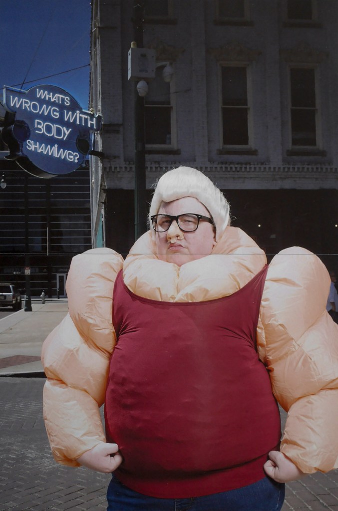 Morris-Cafiero’s photographic narrative reminds me a bit of Martin Parr, who also has a humorous and at times sarcastic view of the world and his role in it, which I reviewed here. But in her case the approach is extremely personal and therefore has an ad hoc focus, directed at very specific issues and expressions. Humor works best when it exaggerates things somewhat, so the artist in this case enlarges certain bodily features in the staged photographs: she adds phony chests and other body parts made of plastic and inflated materials, prosthetic devices that clearly are over the top, and various props, pets, and bystanders. The resulting images make her point very clear: trying to shame a person for their appearance and/or imagined deviations from a supposed norm is simply absurd. You might become a target yourself.