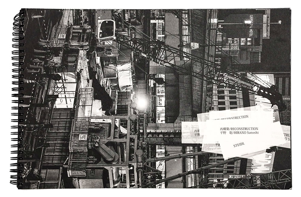 Unlike his countryman Shintaro Sato who’s Risen in the East (Publisher: Seigensha , 2011) documented another ambitious project, the construction of the Tokyo Sky Tree in rich full color all the while emphasizing the quality of light, Reconstruction is presented as contrasty black and white images, printed on paper which can be best described as having the feel of construction paper. The presentation of Reconstruction is modest in direct opposition to the actual project. Reconstruction is spiral-bound with a cardboard slipcover and temporary tags affixed to the cover as if to signal the temporaneous nature of the project. By citing the relative modesty of the presentation of the book I by no means suggest the book is lacking quality instead I read the presentation as a complement to the activity being recorded as well as a clever use of materials to provide a referential relationship.