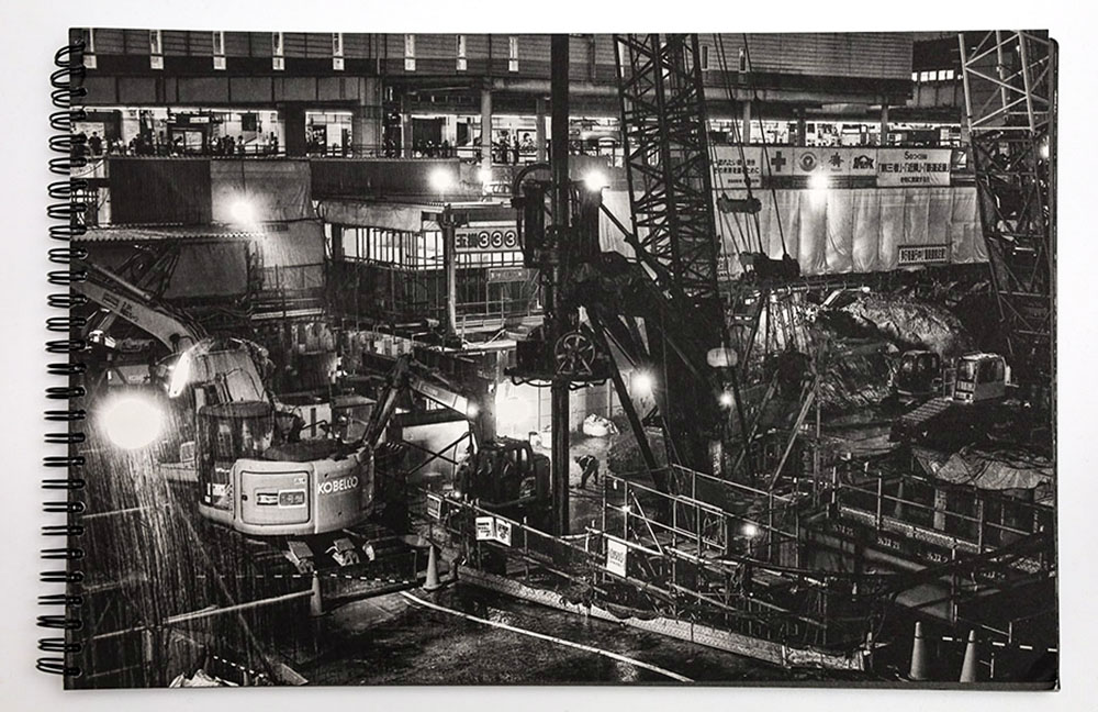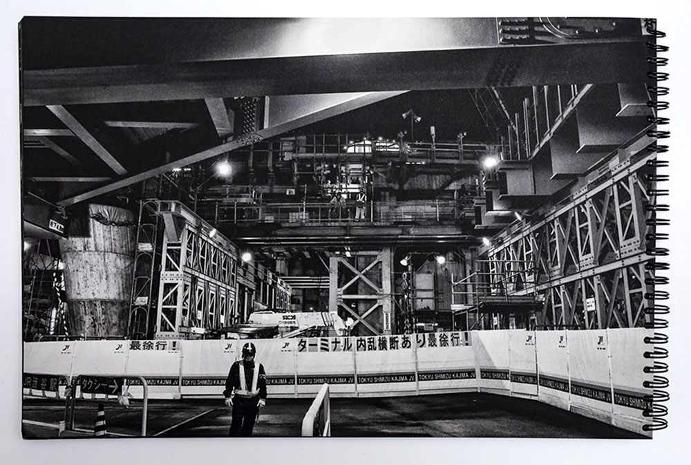 Hirano’s images are printed full bleed and in doing so challenges the viewer’s ability to assume a static viewpoint. One’s eye dances throughout a given image trying to gain a foothold and assume a position where symmetry or visual harmony can emerge. Therein lies the charm of Hirano’s photographs in so far as they present this seeming chaos and disorder in a manner that speaks to the process given the ambitions of the actual physical project and its inherent challenges of reconstructing/expanding one of the most traveled train stations in all of Japan.