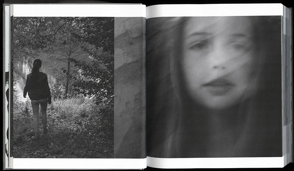 The images showing childhood are especially effective in conveying the situation of an individual undergoing developmental uncertainties that are further marred by sexual violence. The monochrome images are a powerful depiction of a young person struggling to maintain some sense of joy and innocence under these difficult circumstances. The design of the book facilitates a feeling of continuity by using techniques such as splitting a portrait in half between two double spreads, as shown in figures 4 and 5 below. Some of the forces at work are shown as false feelings of comfort or signals wrongly interpreted, displaying the lure of warm colors that are in stark contrast to the monochrome portraits. In addition, Rutsch makes heavy use of symbols: the forest and bodies of water, foreboding, yet also sources of life and renewal – warmth and coldness intermingled. Toys and other elements of the early years serve as reminders of the need to protect the vulnerable.
