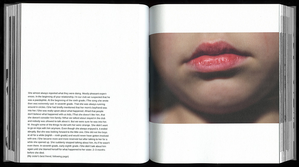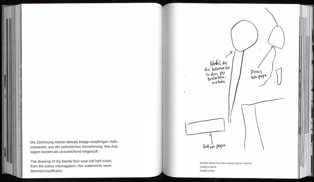 Rutsch does a great job presenting these issues as a project that keeps us spellbound from beginning to end. We are able to visually share the vulnerability of childhood, the fear of places and circumstances where danger might loom, the diary entries and drawings that point to perpetrator figures and circumstances that are difficult to put in words, especially for very young children. We find out that sexual abuse and unexpected deaths are extremely underreported and underinvestigated; her research found this to be an extensive phenomenon in society as a whole.