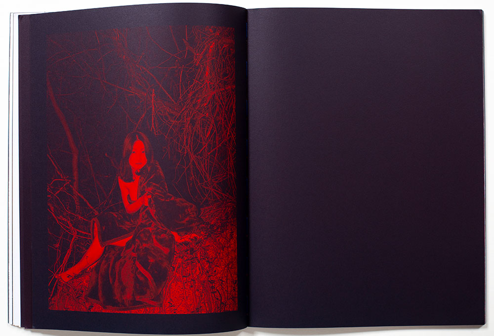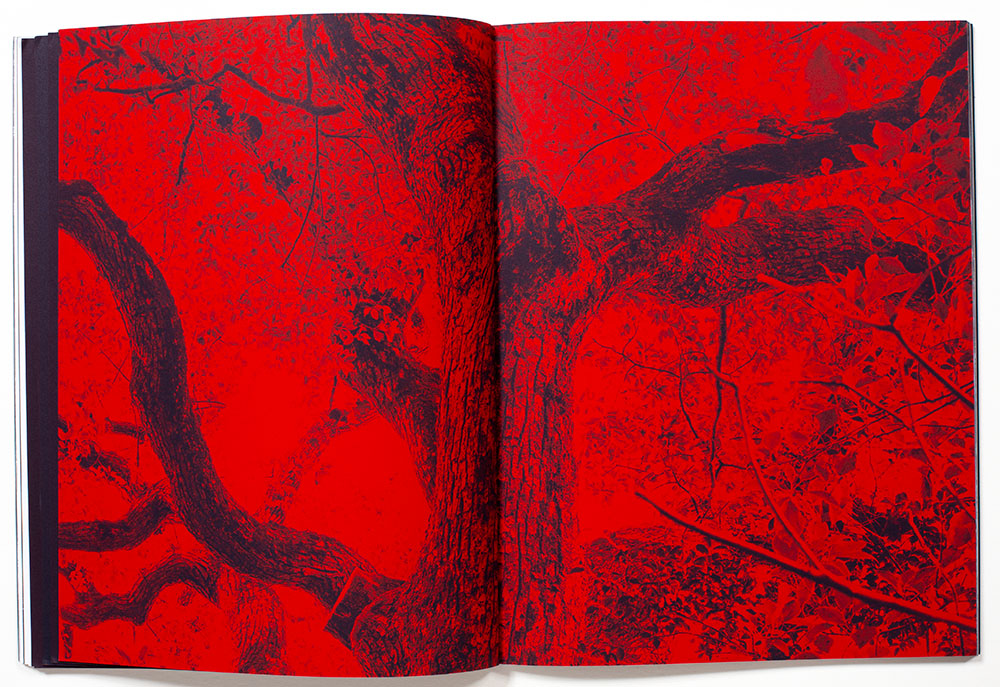 The book design reflects a shift in the photographer’s perspective created by printing the mid-section of the book on a very different paper, with the interesting name of ‘Curious Matter Desire Red’ (weight of 135 gm/m3). This section shifts to graphic, high contrast red and dark purple images, with the dark purple printed as a reverse negative. What would be white is printed as a red, similar to the graphic treatment for the book’s covers. It is startling, if not a shock, to encounter this change-up, but I found it to be an interesting way to try to describe something that is foreign in concept. It is a complete visual departure and is both unsettling and disorienting.