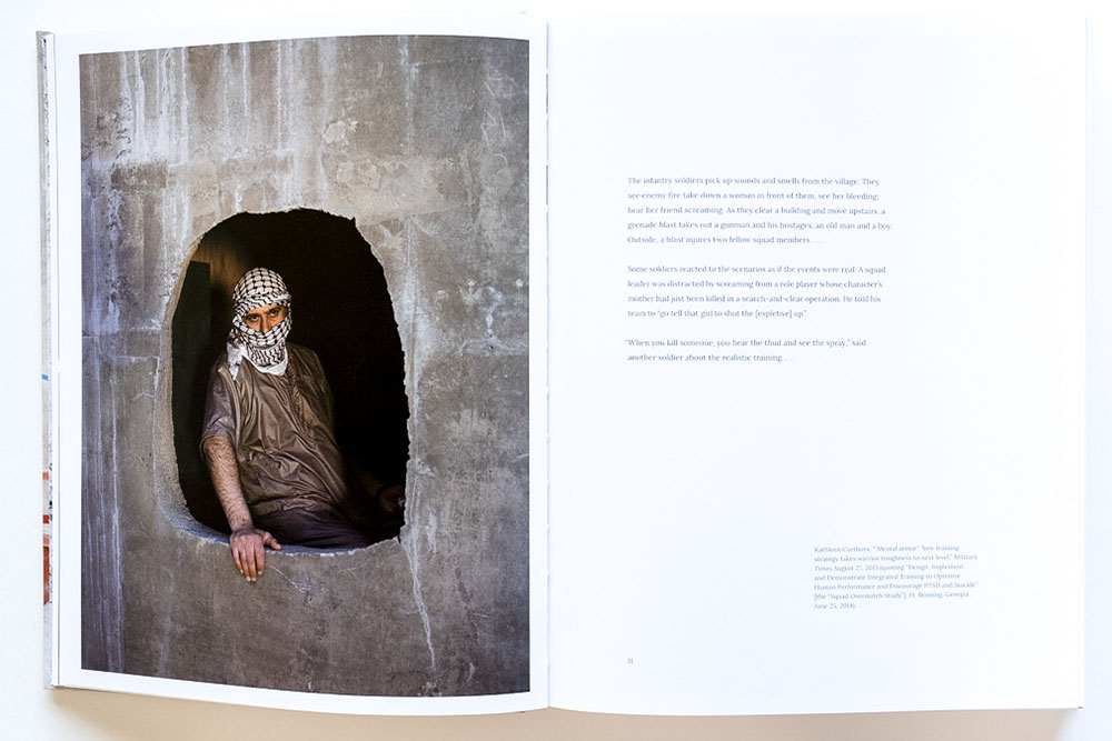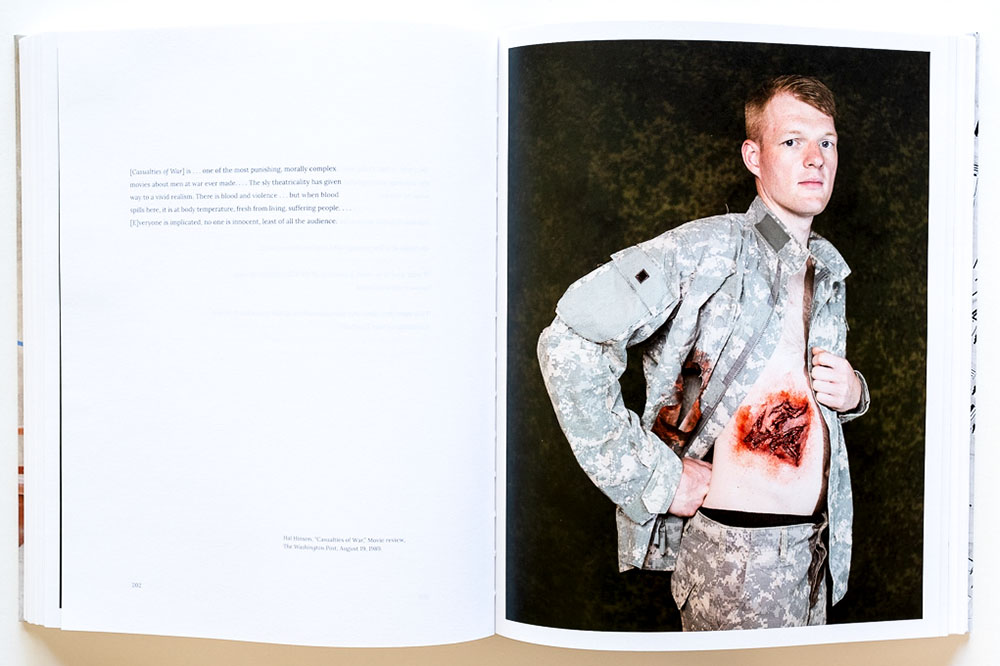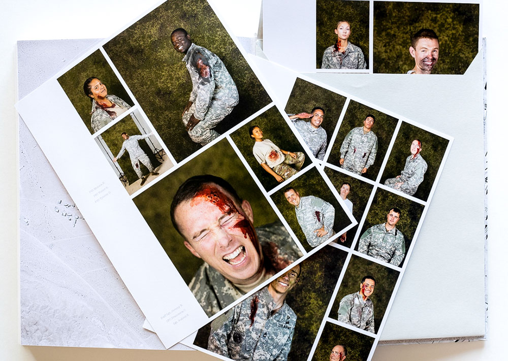 The book itself, published by Radius Books, is beautifully produced. The rich color images are printed large, nearly 8 x 11 inches. Some are full bleed, and some extend over both pages of a spread. There are also some surreal extras. An envelope attached to the inside back cover contains contact-print-like sheets of photos showing soldiers in their casualty makeup, mugging for the camera. A pamphlet inserted in one page of the book contains a case study of an actual war game that went tragically awry when a real police deputy confronted a truck containing role-play terrorist; he killed one “terrorist” and injured another.