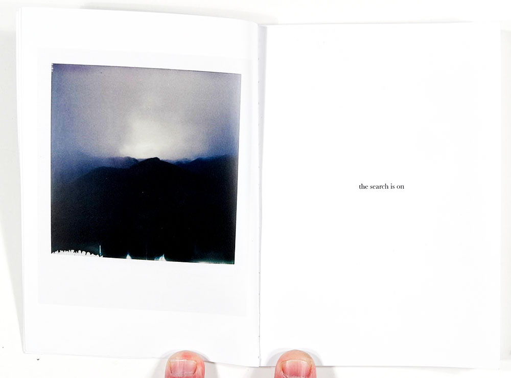 The only problematic aspect I find in this wonderful volume is Behlen’s introduction (and to a lesser extent the quotes by Thoreau and Gibran). To this reviewer, these texts are unnecessary and even counterproductive. The poetry of this object, of its structure and organization, of the images themselves, makes these texts superfluous. The reader/viewer leaves the introduction to encounter a spread with, on the verso, an image of what seems to be an overcast, foggy mountaintop. A spot of light breaks through in the center of the frame. The ambiguity of the image mesmerizes while the development flaws at the bottom of the image render this view particularly human. Recto is a simple line of text: “the search is on”. No more need be said.