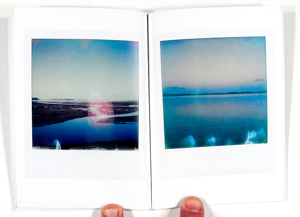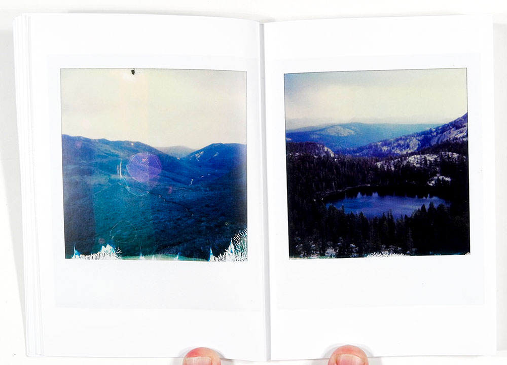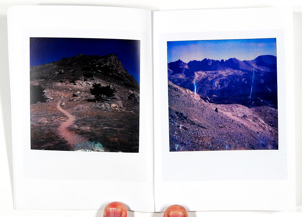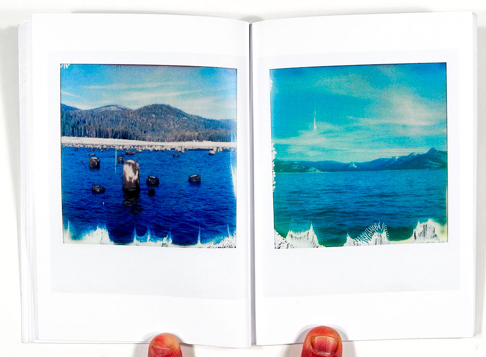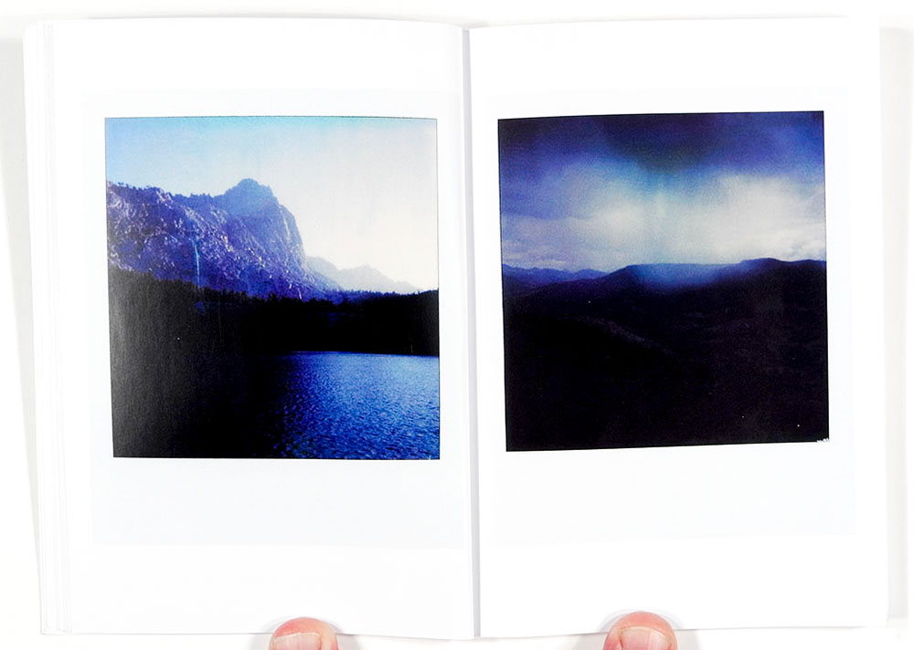 The book itself is a slim, perfect bound edition, 4” x 6” (the same size, of course, as a traditional, commercially printed consumer snapshot). The 56-page volume contains 45 images of what on a first consideration, seem to be banal vacation landscape Polaroids. The printed size of the images, 3.5” x 4.25”, is the same size as the Polaroid 600 series image that is ejected from the camera, including the classic white borders. (To contextualize: Searching for Stillness Vol I also consists of Polaroid imagery, but includes urban scenes and portraiture as well as landscapes, and is printed as a larger 5.25” x 8.25”). The book object is presented in a black cardboard box (4.75” x 6.75” x .75”) with title and author embossed in silver foil. Included in the boxed set as a kind of “bonus” are 4 postcards featuring images from the book (these postcard images being just slightly larger than an actual Polaroid 600 print).