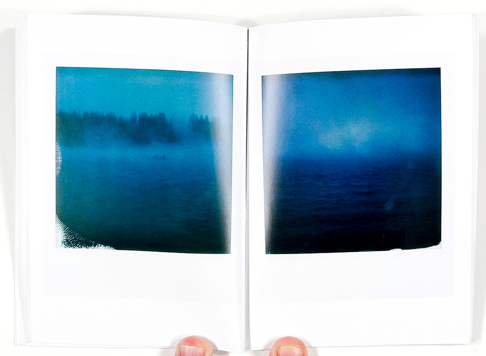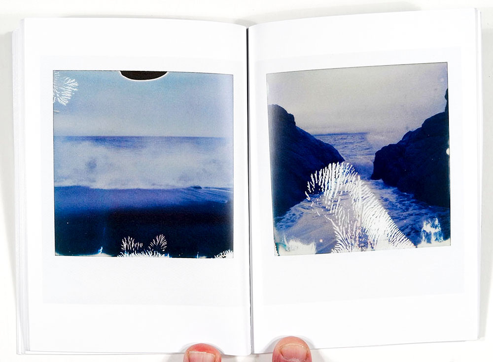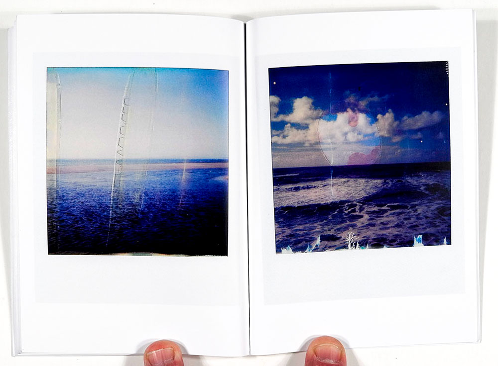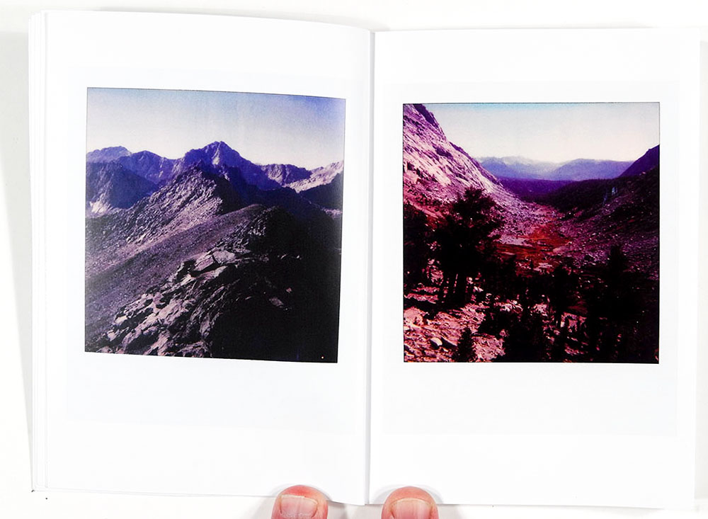 The book itself is a slim, perfect bound edition, 4” x 6” (the same size, of course, as a traditional, commercially printed consumer snapshot). The 56-page volume contains 45 images of what on a first consideration, seem to be banal vacation landscape Polaroids. The printed size of the images, 3.5” x 4.25”, is the same size as the Polaroid 600 series image that is ejected from the camera, including the classic white borders. (To contextualize: Searching for Stillness Vol I also consists of Polaroid imagery, but includes urban scenes and portraiture as well as landscapes, and is printed as a larger 5.25” x 8.25”). The book object is presented in a black cardboard box (4.75” x 6.75” x .75”) with title and author embossed in silver foil. Included in the boxed set as a kind of “bonus” are 4 postcards featuring images from the book (these postcard images being just slightly larger than an actual Polaroid 600 print).