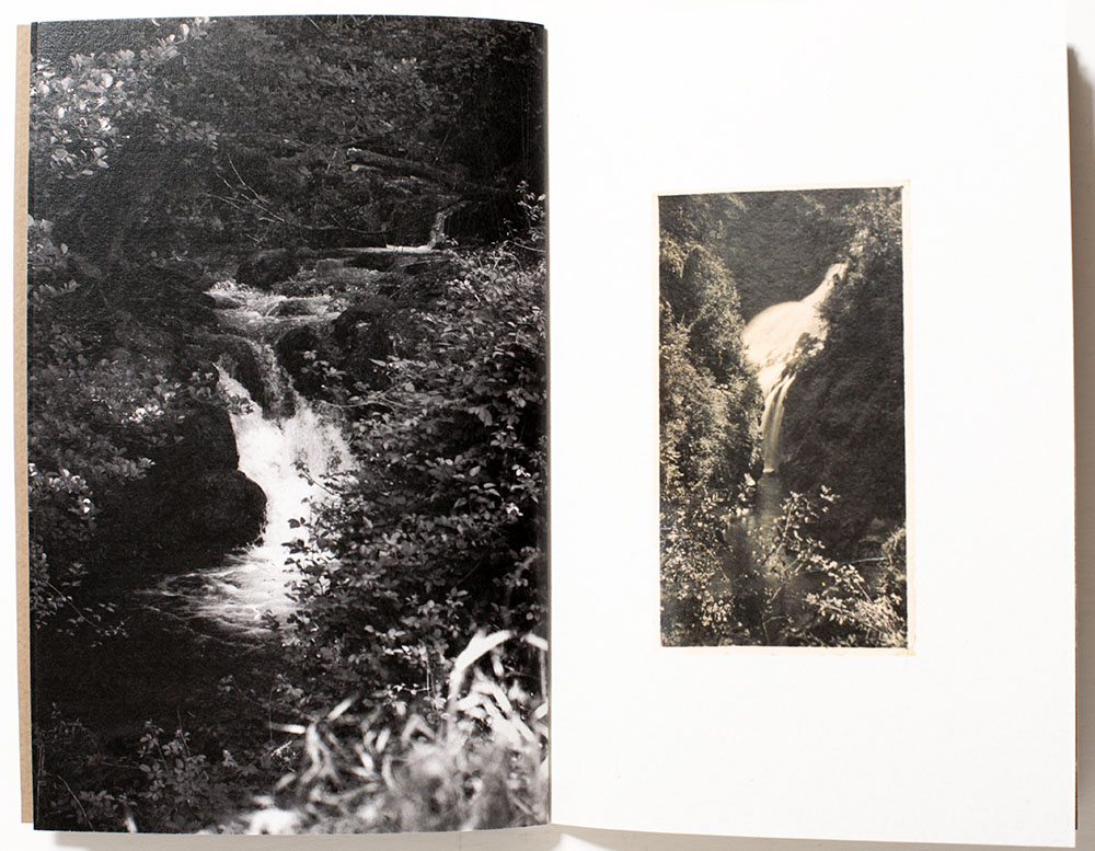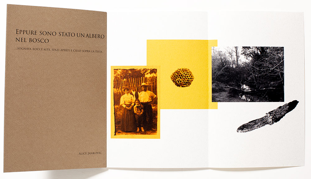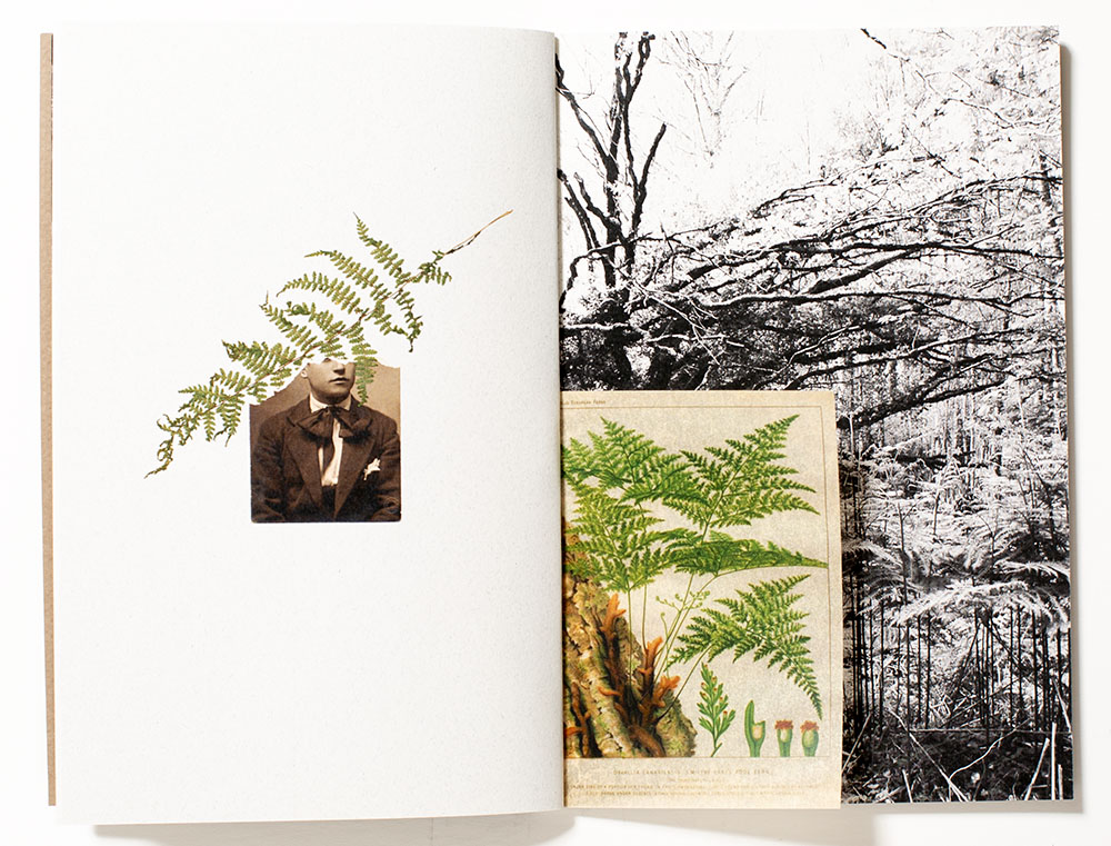 In Yet I Was a Tree in the Woods she intertwines found family archival photographs that have a vernacular appeal with those photographs of her own making. To this are random layers of ephemera, perhaps part of the archival or found to be inspired for this narrative. In a non-linear way, these elements build upon and strengthen the overall reading of her story. There is a mash-up of the natural landscape with urban elements, early ‘selfies’ of individuals in the woods, a woman’s portrait, of whom we can only guess and a closing gatefold of a night time event, be it the stars overhead or perhaps lightening bugs freely roaming a forest.
