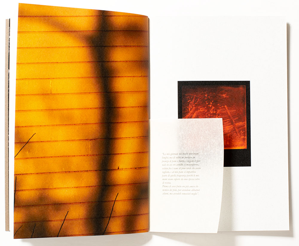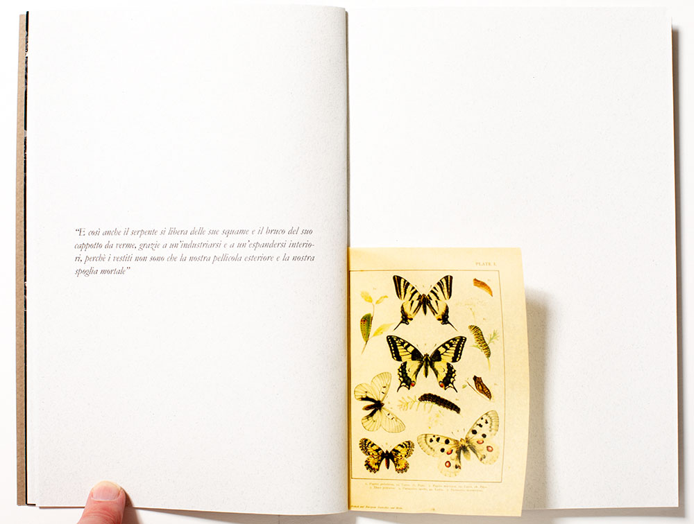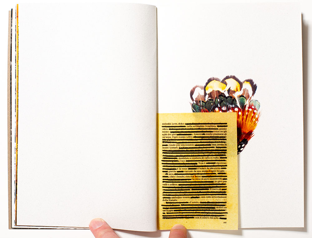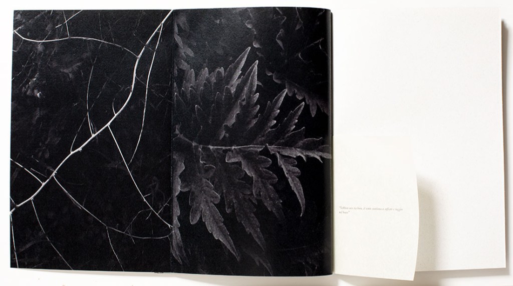 The intricately designed book with multiple gatefolds, interleaving various size pages is a complex printing endeavor that showcases her current artistic studies. A point I frequently belabor is the tight binding of a perfect bound book, which I don’t think helps her publication. The text is in Italian and adds another layer of mystery for me, that perhaps frees me up to react to the visual elements of this poetic work. There are no captions, and even if there were, provided in Italian these might as well be Greek to me.