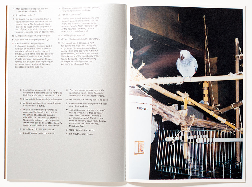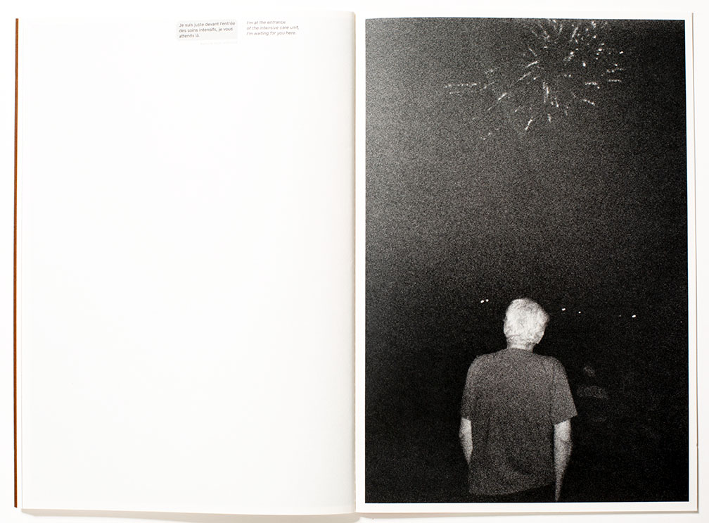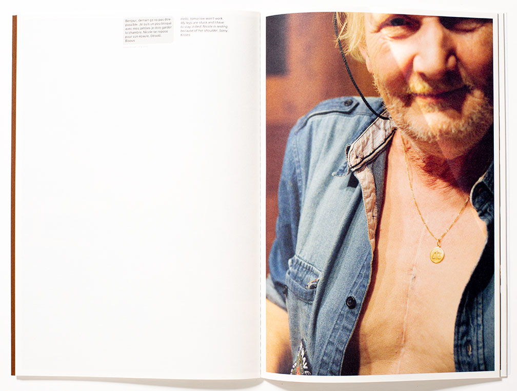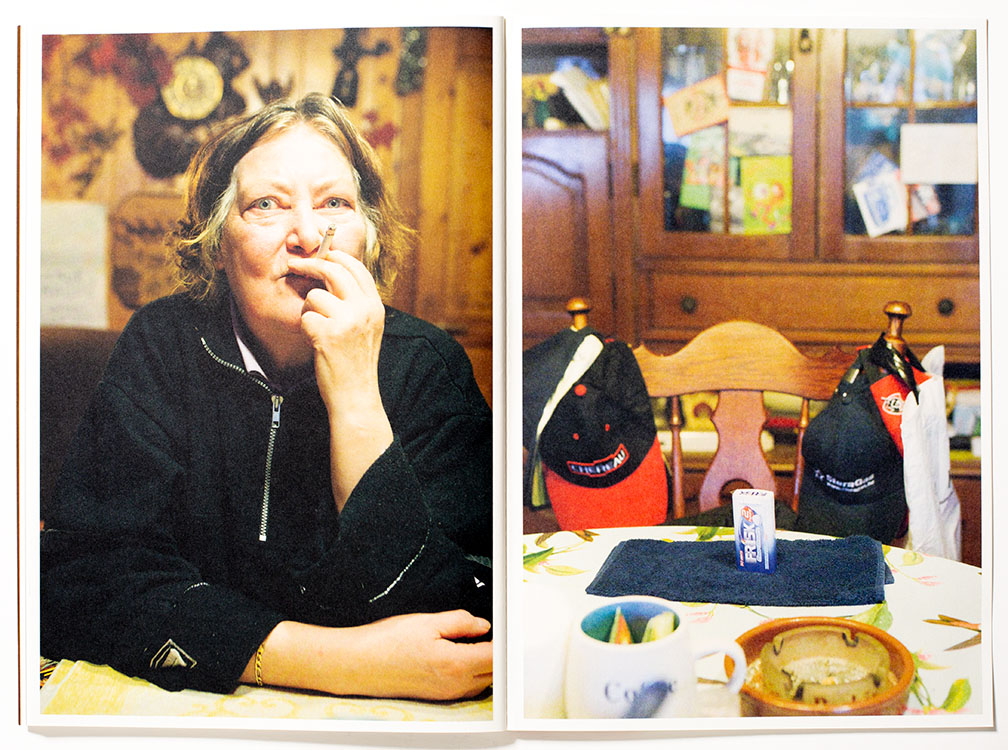 The captions are provided in French with English translations stemming from interviews and text messages between Longly and her subjects. The book has an informal look and feel, as though somebody had rolled up the newspaper and quickly ran a stitch down the center. The text block has not been trimmed, thus extends slightly beyond the book’s covers, a nice physical metaphor that hints that the book’s story is perhaps not neat and tidy. The photographs by Blieke and Nicole are in a section of the book, printed in a brown and white tonality that appears very different from Longly’s color photographs. I am actually unsure of this different visual treatment other than to differentiate the two viewpoints.