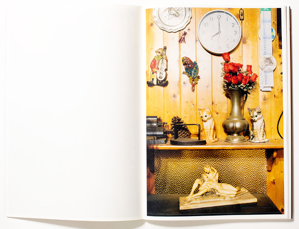 There is a non-judgmental element about this documentary project that allows her subject’s voice to be heard. Her subjects who live honest, yet perhaps simpler lives, are photographed straight forward in an unflinching manner. The couples underlying humor is characterized in their arrangement on one shelf of the small sculpture of the nude couple in a romantic embrace while upon a higher shelf, they had situated two cat sculptures which are gazing down on this romantic event.
