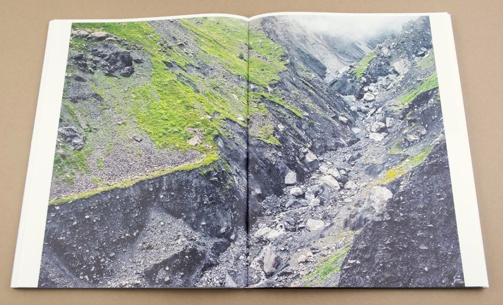 The images display a pleasant and surprising variety of shapes and sizes as well. The texture of the paper they are printed on varies throughout the photobook: some are on stock that is a nod in the direction of the rough nature of the stones depicted, while others are printed on paper with a semi-glossy surface. Monochrome images predominate, with warm or cold tones added where it enhances the effect of the depicted stonescapes. Occasionally there is a splash of color, for instance, to show emerging or existing vegetation. As shown in the sample pages below, another positive feature are the interspersed half pages that contribute to the tactile involvement of the viewer. The design and presentation dovetail beautifully with the subject.