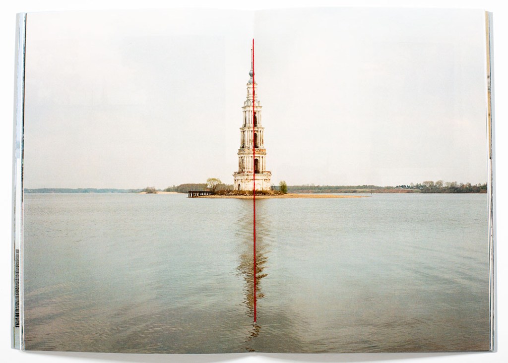 From past experience, I have come to understand that in Borissova’s books, nothing happens by chance, thus I make note of the page spread in the middle of this book. Each zine has a unique colored thread for the pamphlet stitching and the color of the tread in The Further Shore is an intense red, a color I associated with the Russian flag. This stitching thread bisects the full-page photo spread in the middle of the book of what appears as an isolated church ruin surrounded by the murky water. An abandoned church ruin created by the 1930’s communists’ regime that had little interest in preserving history and heritage, and even less interest in things with religious connotations.