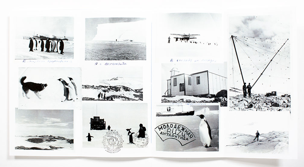 White Blonde (Zine Collection No. 5) is a recreation of her signed and number limited edition hard cover book (250 copies) with print that was published by Editions Bessard. As with her other zines, she has modified the layout, sequencing and design of the illustrations, and for this book she has included a center gatefold that works well with her zine design template. This book has an autobiographic element and for this project she froze historical photographs from Russian explorations of Antarctica that are interspersed with her frozen self-portraits.