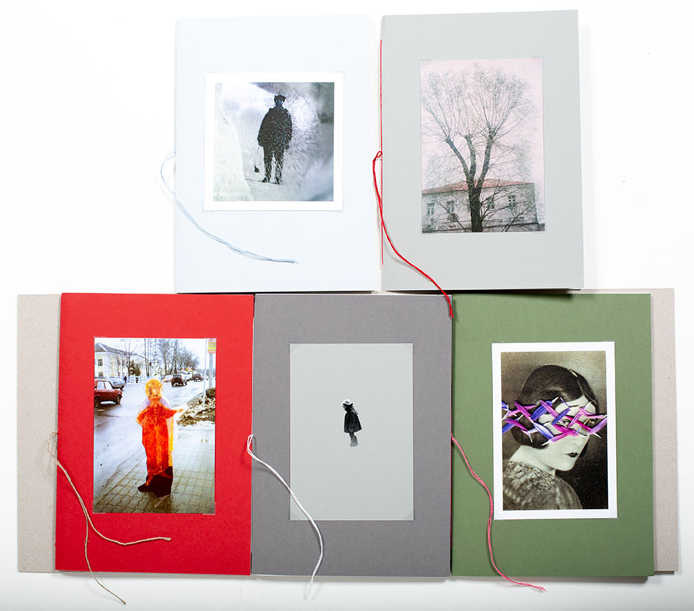 Stiff covers, tipped-in image, set of five, board cover with glued symbol and red rubber band closure, pamphlet stitching, signed and numbered, edition of 200, printed and assembled St. Petersburg, RU.