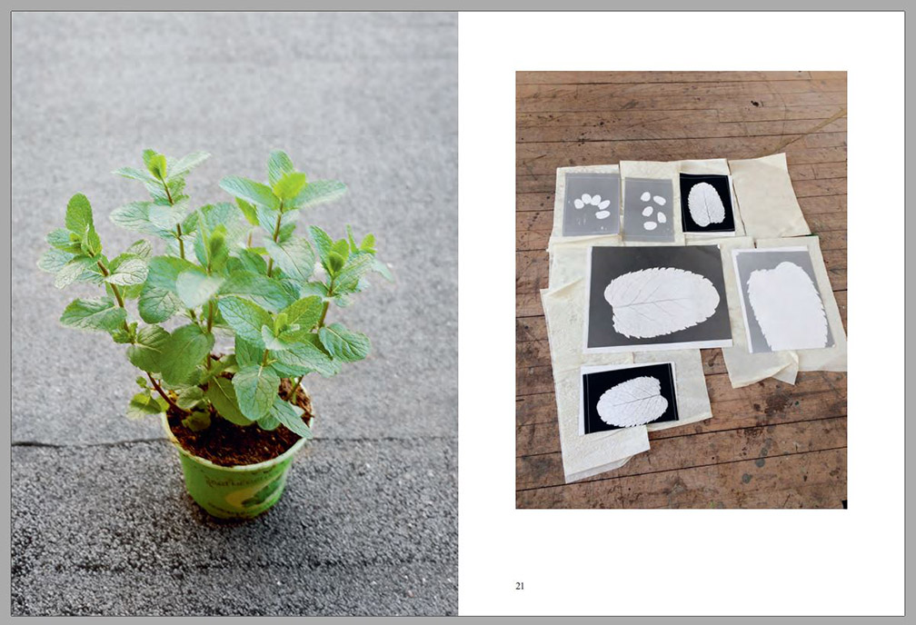 The book starts with a project investigating patterns that relate to landscapes: fabrics and hides are laid out by workmen to receive treatment; they form similar ‘scapes’ waiting for human tools to act upon them. The transition to photograms that make use of light-sensitive materials – analog photo paper to memorialize plant shapes and patterns seems a related process that references photography, including the recording of rocks with photographic tools to relate a variety of ‘gestures’ or patterns of the natural world.